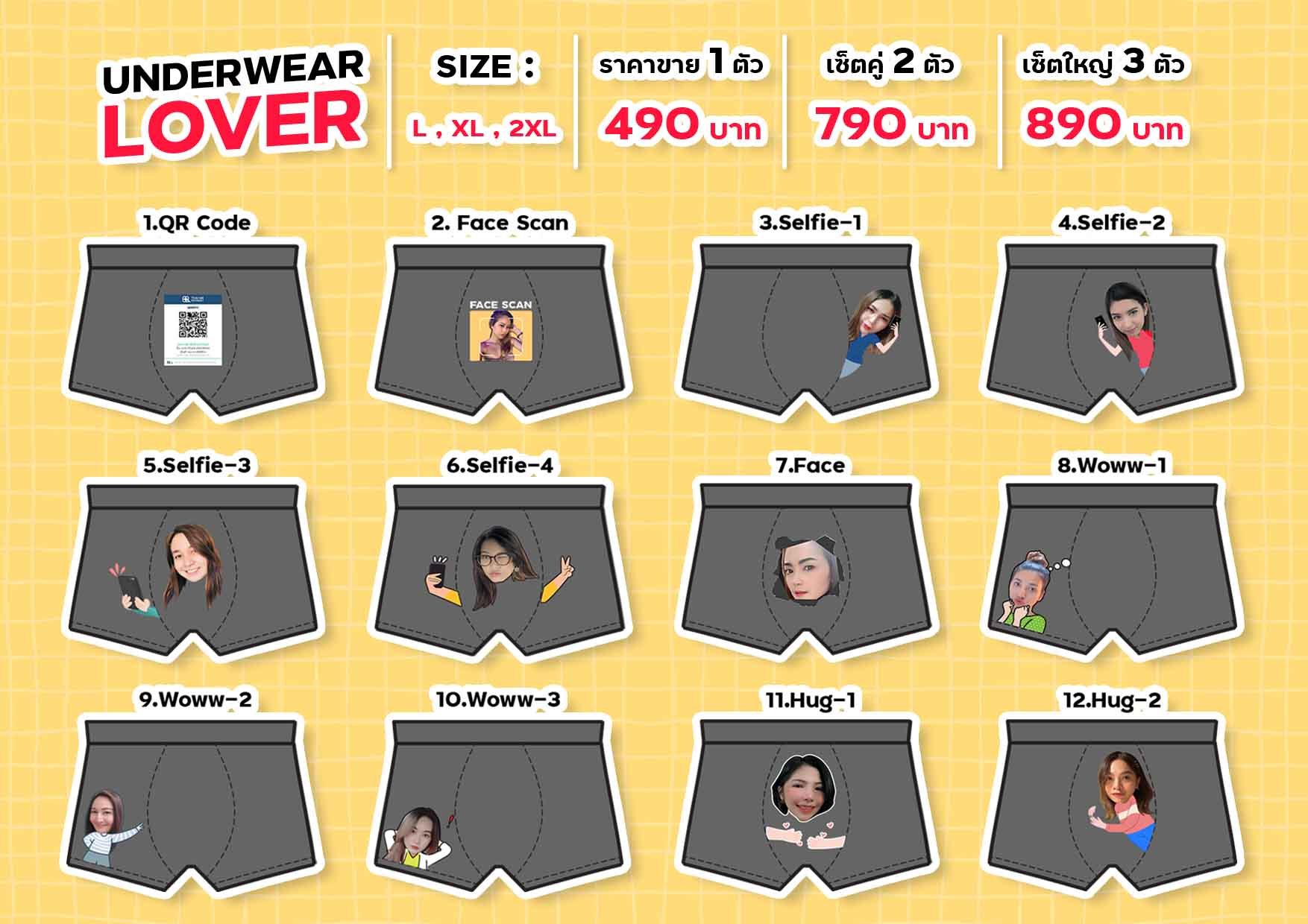 กางเกงในสกรีนภาพหน้า - เป็นสินค้าใหม่ของทางบริษัท ที่เปิดตัวไปไม่นานนี้ และลูกค้าตอบรับดีมากๆเลยครับ โดยเรามี Template ให้ลูกค้าเลือกถึง 12 แบบ ที่สำคัญ หากลูกค้าไม่ต้องการเลือกลาย สามารถสกรีนภาพแบบไหนก็ได้ครับ