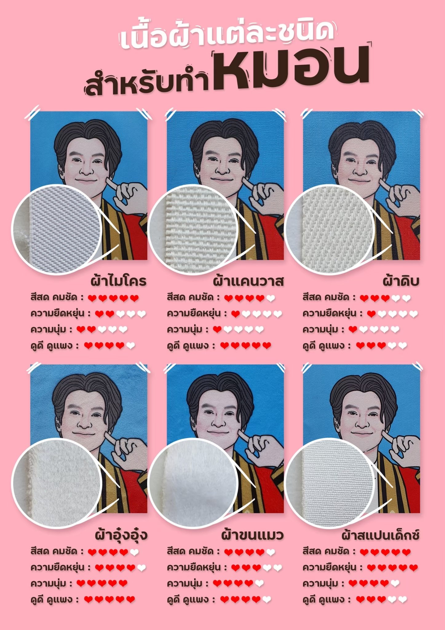 เนื้อผ้าชนิดอื่นๆ ทางบริษัทมีทุกชนิด แต่ที่นิยมใช้ในการผลิตหมอนเป็นส่วนใหญ่ ทางเราจะให้ผ้าไมโคร เนื่องจากคุณสมบัติในการสกรีนได้แล้ว ยังดูแลรักษาง่าย สีที่ได้จากการสกรีนจะคมชัด ตามความต้องการของเราอีกด้วย อีกทั้งต้นทุนต่ำ แต่ยังคงความมีคุณภาพดีอีกด้วย
